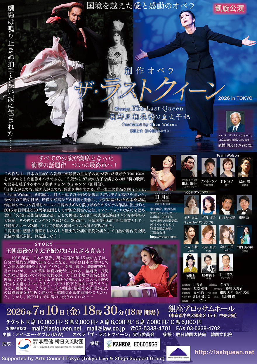 今回の公演「あの海を越えて」では、デビュー当時から世界各国で歌い続けてきた珠玉のコリア歌曲や、オペラ「ザ・ラストクィーン」の名場面など田月仙ならではの演目が披露される。また豪華ゲストを迎え、日本を舞台にしたイタリアオペラの傑作「蝶々夫人」がどのように演じられるのかも見逃せない。この舞台には、蝶々さんのように毎日のように海を眺めながら、愛する家族との再会を待ち続けた名もなき無数の魂への祈りが込められている…。 |
